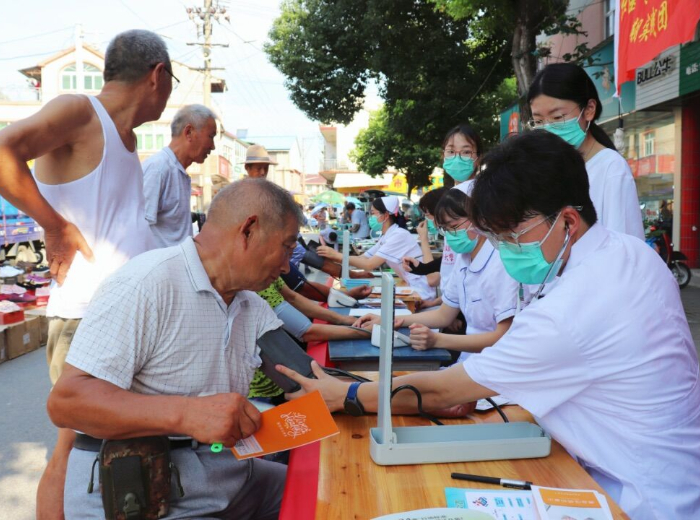 联合义诊暖民心,携手志愿惠民生。在当地卫生院的帮助下,实践队员在农贸市场旁摆放义诊设备,队员们为当地居民测量血压,用通俗易懂的语言向居民仔细讲解高血压高血糖预防、用药注意事项等相关知识,并发放宣传手册帮助更多的社区居民树立正确的健康意识,促进健康文明社区建设。