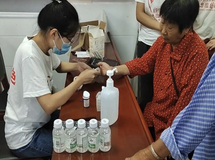 在小庙镇高岗村退役军人服务站,实践队还开展了简单的义诊活动,为村民测量血糖、血压,用专业知识和通俗易懂的语言,普及高血压、冠心病等各种常见病的发病表现及预防措施,并为村民提供就诊意见。在社区医生指导下,实践队成员不仅开展知识宣传,还提供个性化的生活指导方案,助力居民养成健康的生活方式。