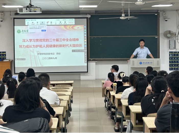 薛磊作了题为《深入学习贯彻党的二十届三中全会精神 努力成长为护佑人民健康的新时代大国良医》的主题讲座。他表示,党的二十届三中全会对进一步全面深化改革、推进中国式现代化作出战略部署,同学们要将学习贯彻全会精神与学科专业发展、个人成长成才紧密结合,坚定理想信念,明确自身定位,做好学业规划,不断增强作为新时代护理人的使命与担当,努力成长为护佑人民健康的新时代大国良医。