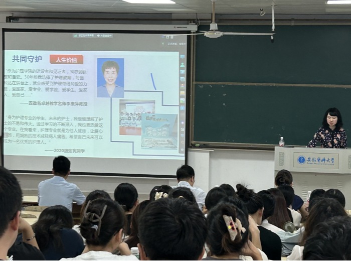 洪静芳以《珍惜幸运,明灯指引向未来》为题,鼓励新生践行南丁格尔精神,坚定未来职业发展道路。她将一座城、一所院、一群人、一件事串联,为新生作了生动的院史院情教育,并以“青衿之志 履践致远”为关键词,教导他们只有将远大志向与脚踏实地的努力相结合,才能走向更光明的未来。