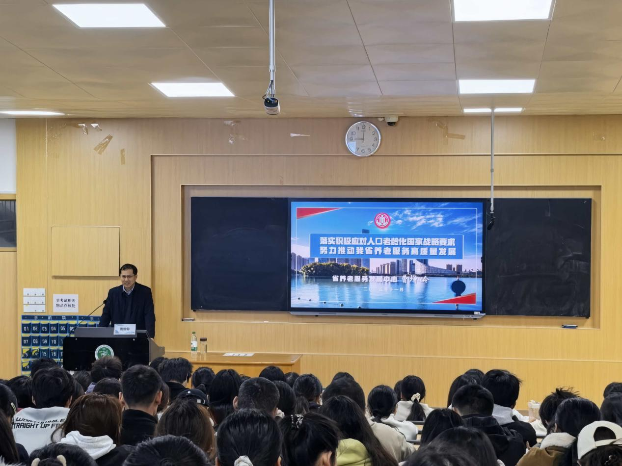 曹增皊以“落实积极应对人口老龄化国家战略要求,努力推动我省养老服务高质量发展”为主题,结合安徽省养老服务发展实际、翔实的数据,运用基层养老服务案例,从国家战略的宏观部署切入,逐步延伸至安徽省养老服务政策体系的顶层设计,再到社区嵌入式服务、机构养老提质等基层实践探索,全面展现我省养老服务事业发展的全景图。讲座既分析了当前养老服务体系建设中资源供给、专业人才储备等方面的挑战,又围绕“精准化服务”“智慧化赋能”“专业化支撑”提出建设性发展思路,兼具理论高度与实践温度,让在场师生深受启发。